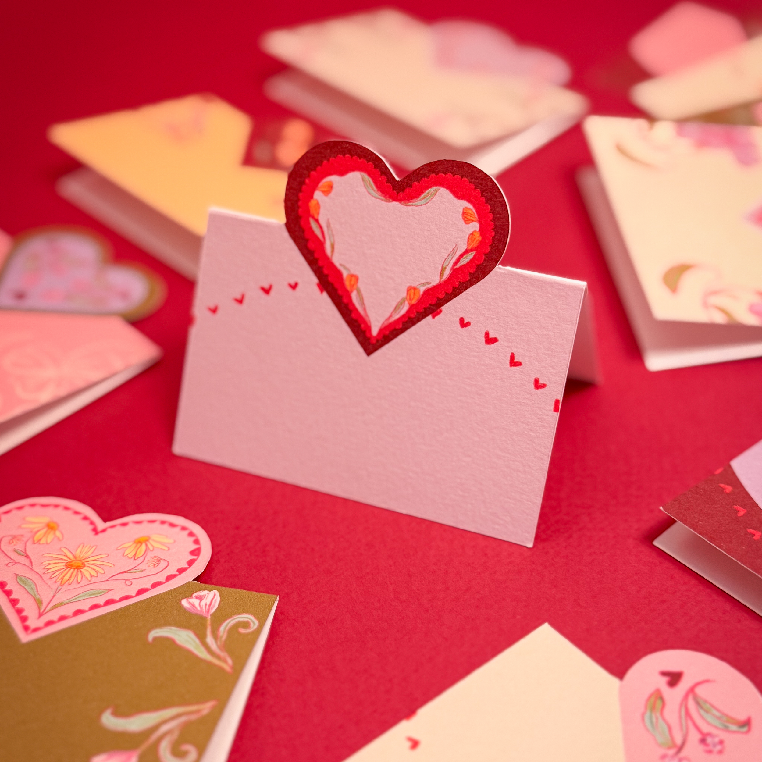 Folded place cards, each with a unique design. Ideal for gatherings, shared meals, or celebrations. Use them to assign seating or to leave a short note for each guest. Sold as a set of twelve, all different.