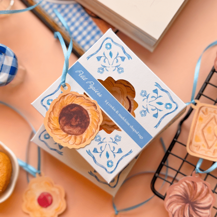 A boxed set of 24 hand-painted tags inspired by classic cookies and madeleines. Finished with a light blue satin ribbon, ready to adorn packages, notes, or table settings.