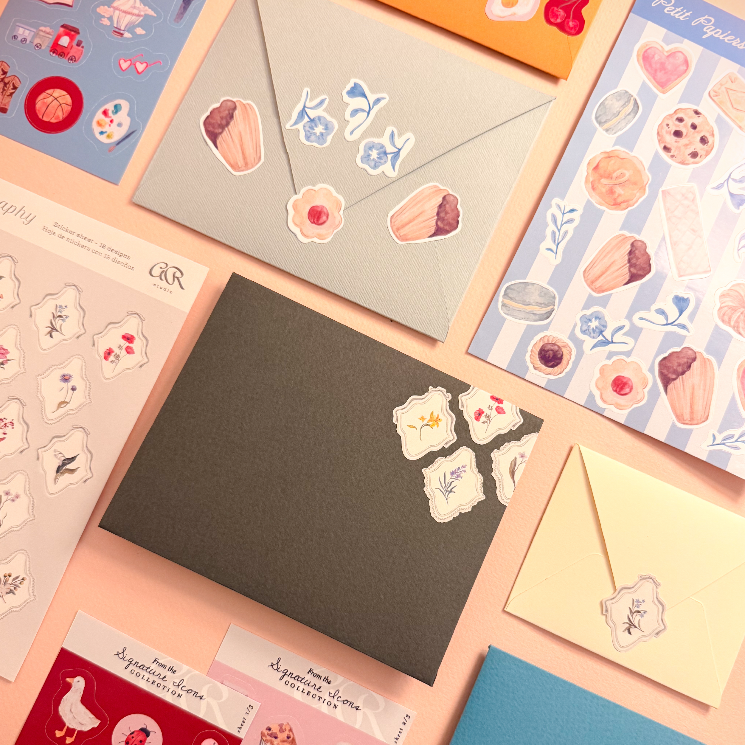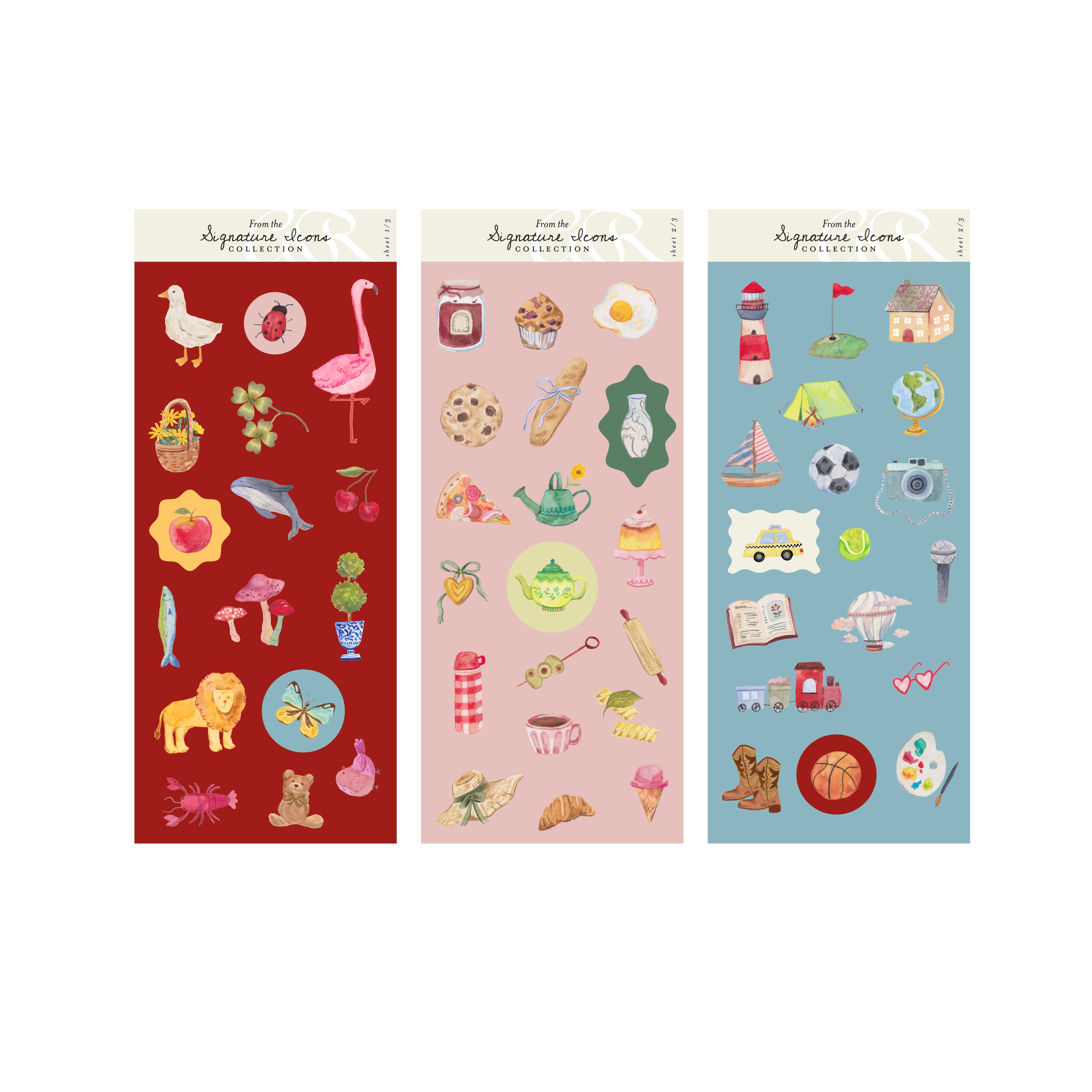 The Signature Icons sticker set includes three sheets with 53 individual stickers, combining florals, objects, food, and small everyday motifs. Designed to offer variety, each sheet allows for different combinations across paper goods and personal projects.